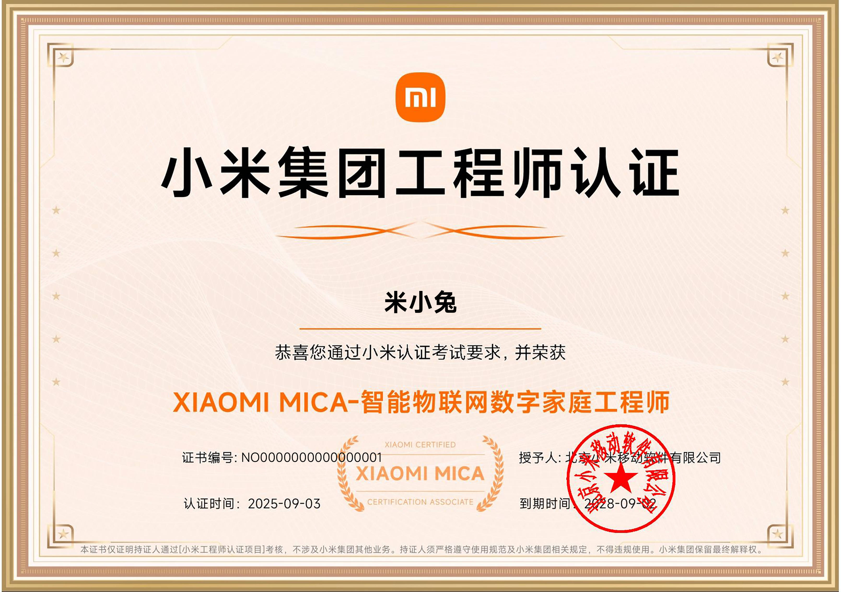 完成培训并通过考核的工程师,将获得 “XIAOMI MICA 智能物联网数字家庭工程师” 认证证书,作为其在该领域专业能力的有效证明。