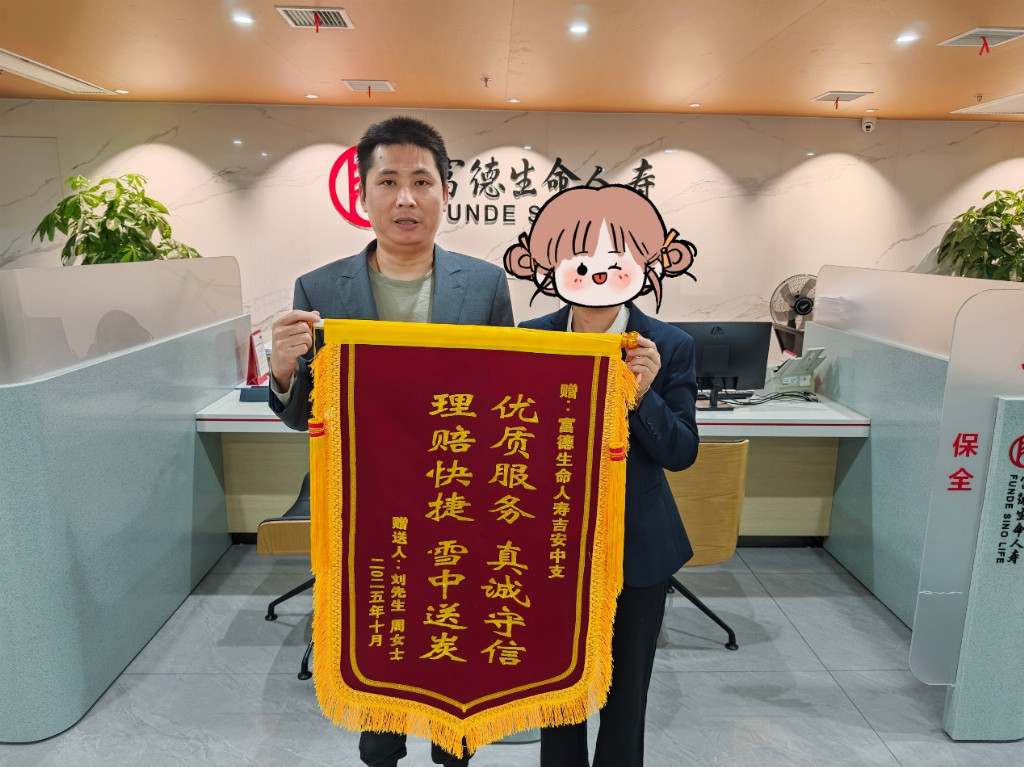 2025年10月27日,富德生命人寿吉安中心支公司前台迎来温馨一幕。客户周女士委托业务员送来一面锦旗,上面“优质服务 真诚守信 理赔快捷 雪中送炭”十六个字熠熠生辉,承载着对该公司高效理赔服务的深深感激。