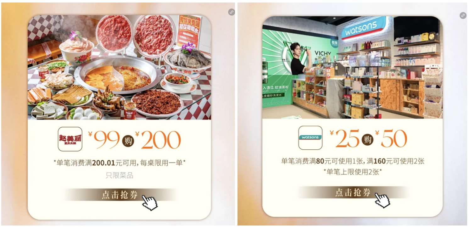 活动期间,消费者可通过小程序抢购多项超值代金券:赵美丽重庆火锅推出99元购200元券,满300元可用;中国黄金上线0.01元抢20元克减券,单笔满20.01元即可使用;屈臣氏美妆则推出25元购50元券,满80元可用1张,满160元可用2张。