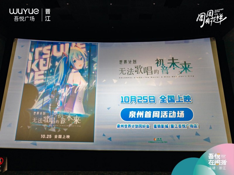 万众期待的二次元盛典——“《世界计划 无法歌唱的初音未来》泉州首映活动场”在晋江吾悦广场星轶影城成功举办并圆满落幕。本次活动由晋江吾悦广场精心策划主办,联合星轶影城晋江吾悦广场店以及泉州MIKU粉丝后援会倾力呈现,为泉州的初音未来爱好者们带来了一场沉浸式的视听盛宴与难忘的粉丝聚会,标志着这部备受瞩目的作品在泉州地区的首次大银幕亮相。