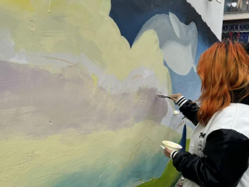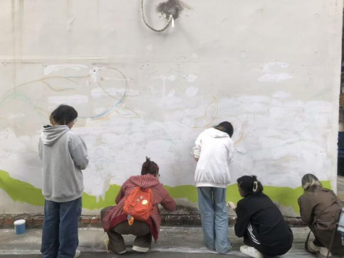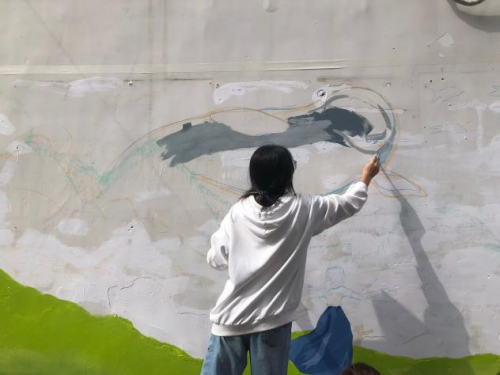 活动当天清晨,志愿者们早早抵达指定墙面,迅速投入准备工作。从墙面清洁、构图打稿,到调色上色、细节勾勒,志愿者们分工明确、配合默契。尽管任务紧、工作量大,但大家热情高涨,专注地将长江江豚、岸边绿植等元素逐一呈现在墙面上——蓝色波纹象征长江奔流,绿色枝叶传递生态活力,卡通形象的江豚则生动呼吁着对水生生物的保护,每一笔色彩都饱含着对绿色家园的向往。
