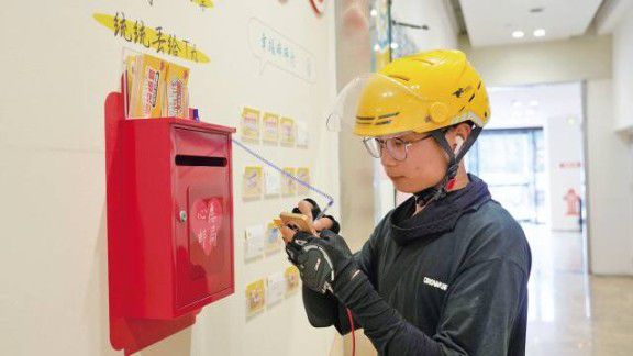 取餐间隙,外卖骑手们还可以到驿站温“新”服务圈,以“抽盲盒”形式,抽取背面印有各式祝福标语的“幸福碎碎念”卡片,写下微心愿投入心愿箱,商圈工作人员将定期收集并助力实现。