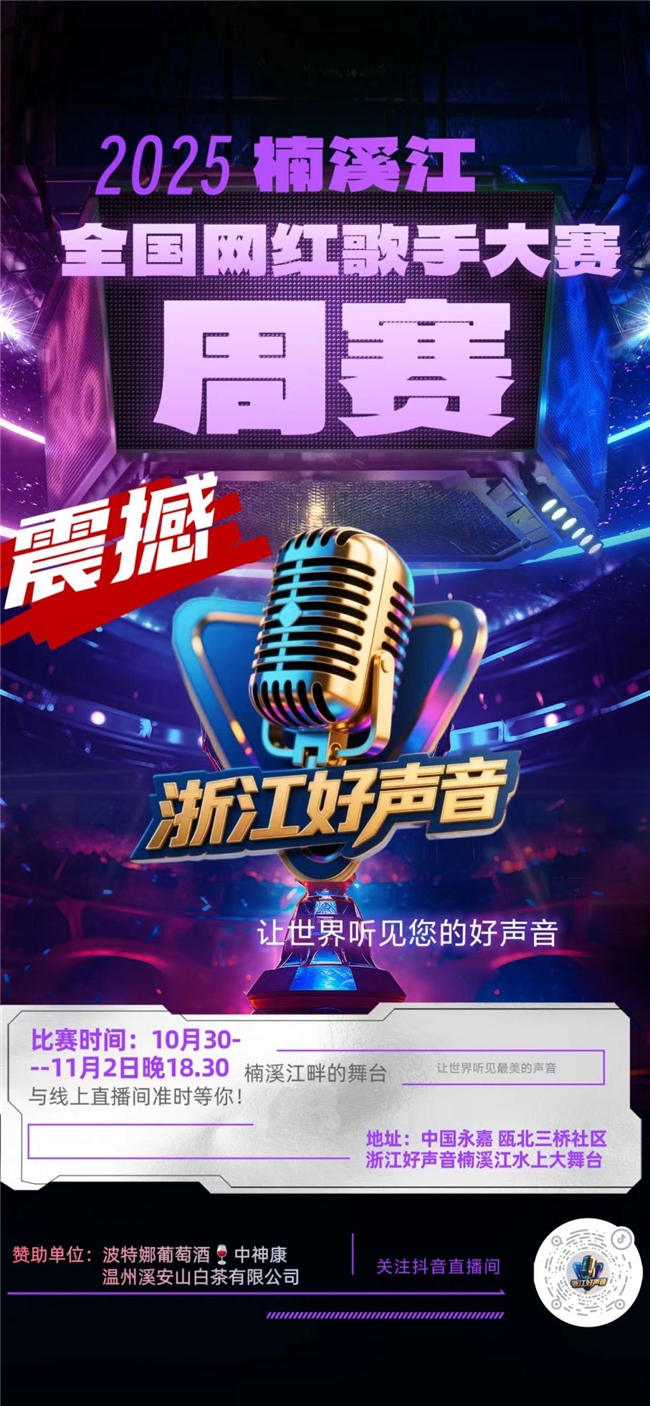当暮色漫过江面,浙江好声音舞台灯光点亮楠溪江山水——10月30日(周四)18:30,“楠溪江网红歌手挑战大赛”周赛将准时开唱!连续三日高能比拼后,11月2日(周日)18:30终极对决来袭,谁能拿下“周度歌王”称号,用歌声引爆浙南之夜,就等你见证!