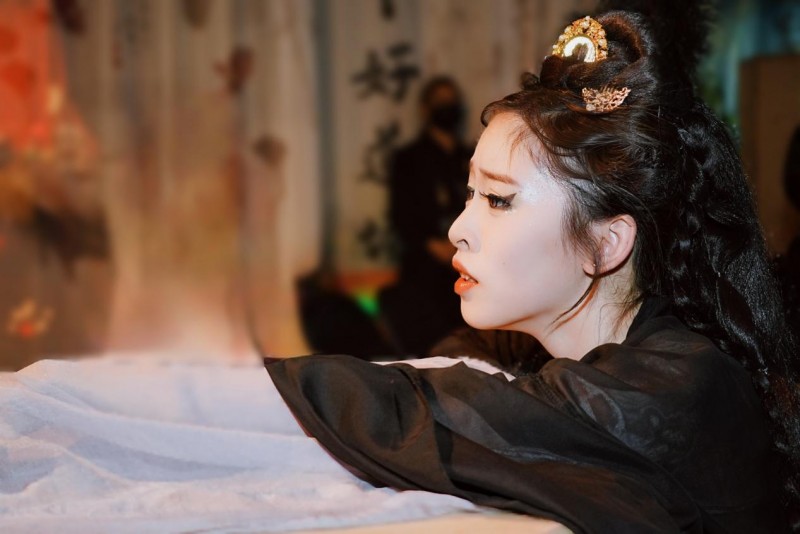 音乐与视觉是东方写意的当代化转译,李梵歌的作曲延续了《一念》中“传统乐器与现代音效对话”的革新精神。例如以古筝泛音象征红叶飘落的无常,用箫声暗喻深宫幽怨,而在矛盾爆发时,电子音效与交响乐撕裂性交织,如第三幕王公公触柱时“声音戛然而止的绝对静默”,以留白营造悲剧张力。匹配以极简纱幕分割空间,通过灯光色彩切换场景——唐代宫廷的华美与压抑以金红基调呈现,而结局大雪中的素白则象征情感的净化与升华。