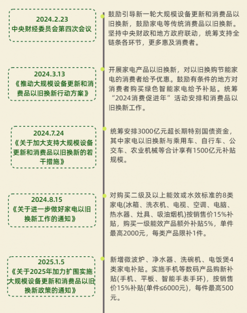 2024 年 2 月中央财经委员会第四次会议明确提出,鼓励引导新一轮大规模设备更新和消费品以旧换新。2024年7月,国家发展改革委、财政部印发《关于加力支持大规模设备更新和消费品以旧换新的若干措施》,提出统筹安排3000亿元左右超长期特别国债资金,加力支持大规模设备更新和消费品以旧换新。