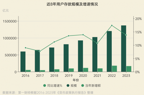 就居民储蓄情况而言,近8年来用户存款规模不断攀升,2023年超过136万亿元,同比增速为13.8%。这一数据表明居民储蓄意愿强烈,在一定程度上抑制了即期消费。在当前经济发展格局下,消费作为经济增长的重要驱动力,其转型升级的态势备受关注。