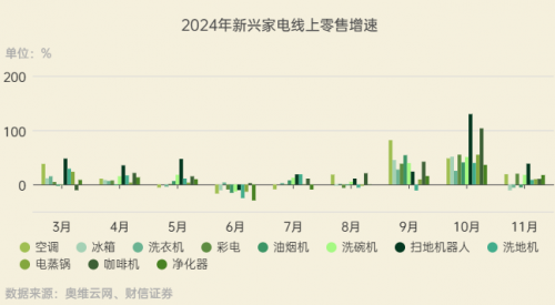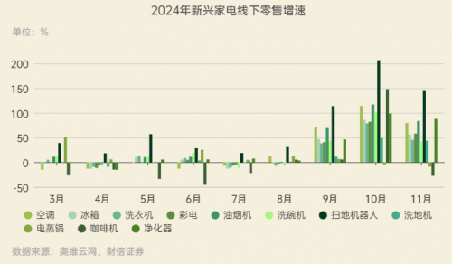 多方合力下,以旧换新市场活力持续释放,消费者也在这场换新中展现出极大的热情。在政策补贴下,居民消费需求都有很好的释放,家电、汽车、数码等多个品类都保持增长,2024 年 9-11 月新兴家电全渠道零售额持续高增长。