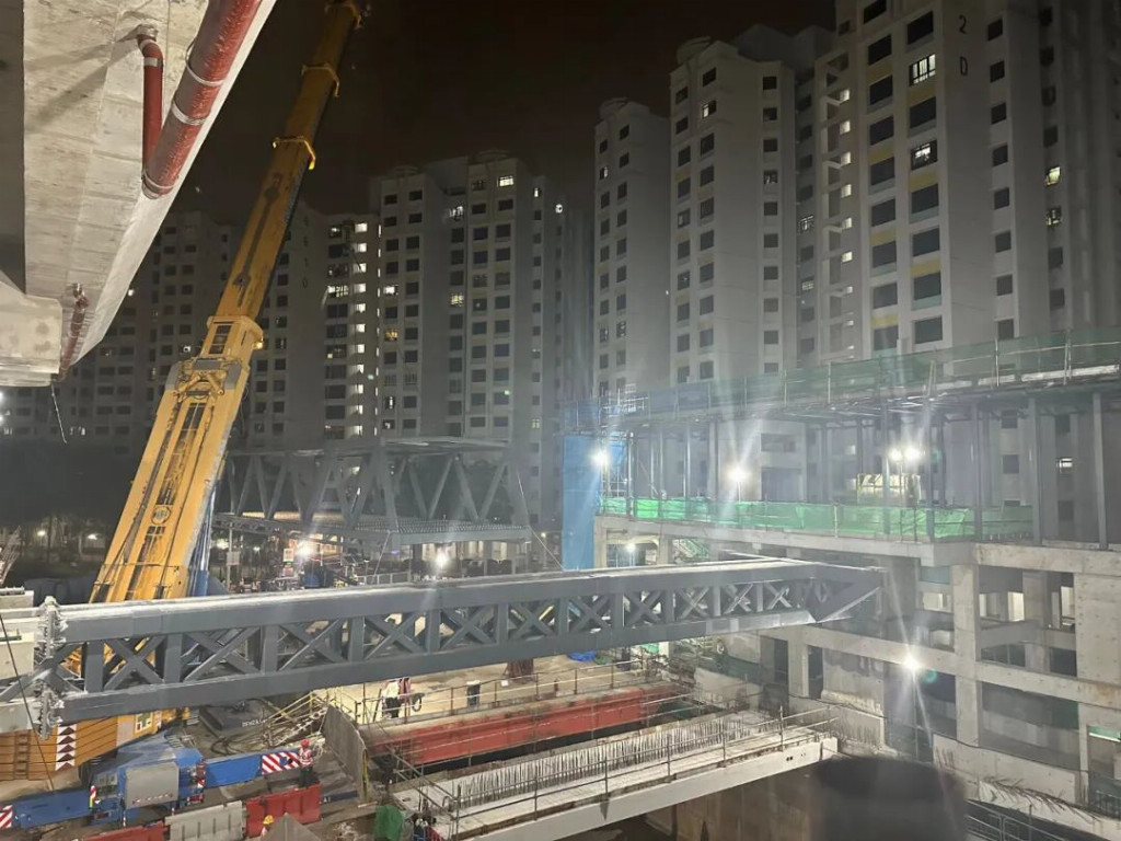 近日,由中交新加坡分公司承建、中交三航局负责实施的裕廊区域线J106文礼地铁站项目取得关键节点突破——连接JS8车站与7号出口的人行天桥钢结构顺利完成吊装,标志着该项目所有车站出口及主站连廊钢结构施工全面收官,为后续工程推进奠定坚实基础。