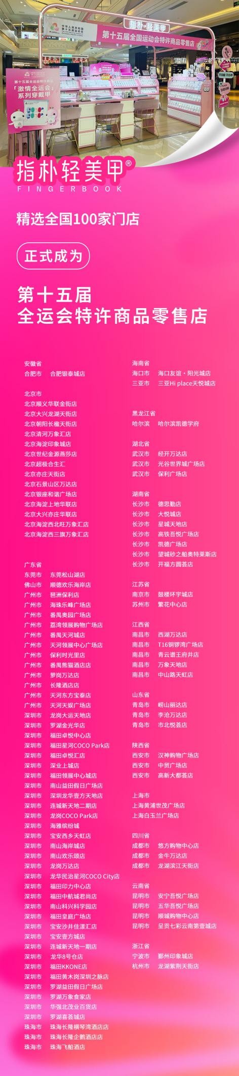 在这场汇聚全国目光的体育盛会中,中国轻美甲开创品牌——指朴FINGERBOOK脱颖而出,精选全国100店,正式成为第十五届全运会特许商品零售店,同步发售本届全运会官方特许穿戴甲。这是中国美甲行业首次获得这项殊荣,标志着“指尖美学×体育精神”的跨界融合迈出全新步伐。