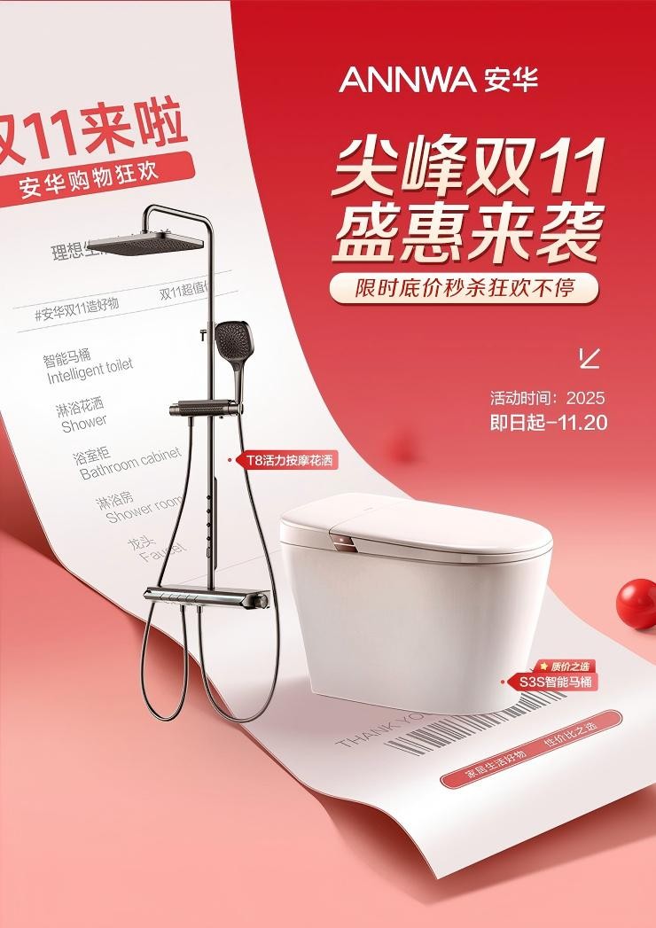 焕新的真谛,在于将日常变为享受;理想的生活,源于每一分投入都物超所值。安华卫浴“尖峰双11”活动,旨在通过专业的产品与解决方案,为消费者实现预算与品质的最优解。即日起至11月20日,安华卫浴双十一盛典在全国终端专卖店同步开启。欢迎亲临安华卫浴门店,感受智能科技如何重塑空间,开启一场真正的“生活焕新”。