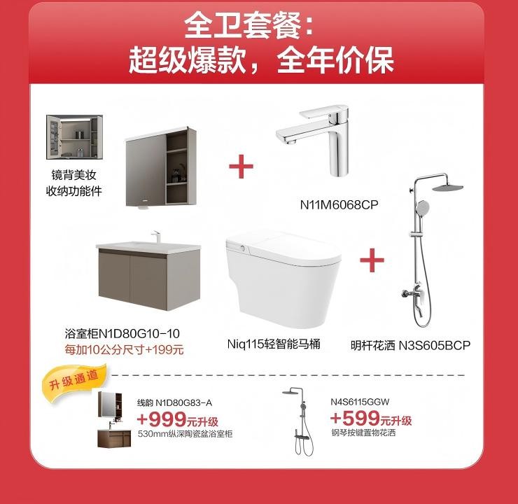 为简化消费者决策流程,安华卫浴推出了多款CP组合与全卫定制套餐。从满足基础功能的简约实用款,到提供奢适体验的高端配置,安华卫浴均提供专业搭配建议,一站式解决洗澡、如厕、收纳等全场景需求。消费者还可根据个人喜好,选择多种花色、门型与台面,实现个性化定制,轻松打造高颜值卫浴空间。更值得一提的是,全卫套餐还享受全年价保服务,确保消费者此刻入手即是年度最优,省心更省钱。