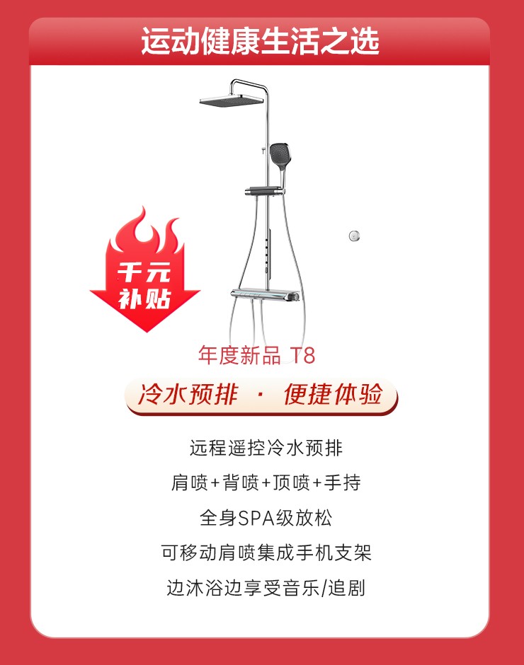 沐浴体验同样迎来革新。T8零冷水按摩置物花洒具备远程冷水预排功能,沐浴时温暖即开即享。其创新的可移动肩喷集成了手机支架功能,让用户能在肩喷、背喷与手持喷头的动态环绕按摩中,可同时沉浸于音乐或影音,将日常沐浴升格为一场酣畅淋漓的居家SPA。