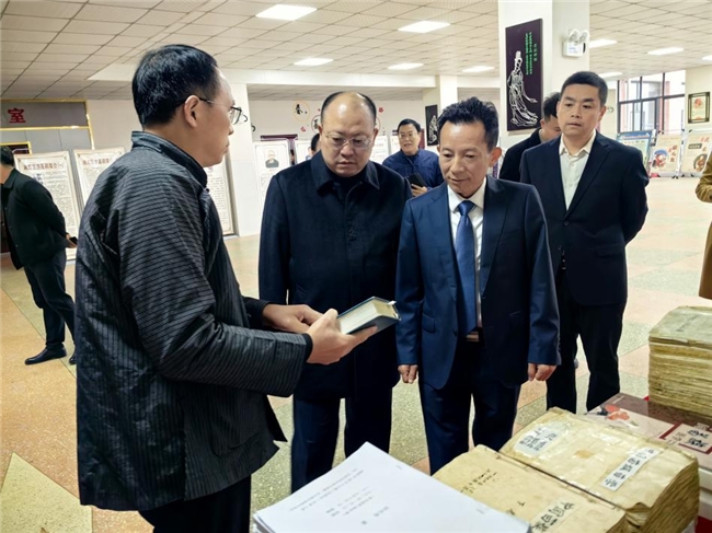 (田小俊向湘西州政协主席李平和深圳市荣益电子科技有限公司董事长李建军讲解即将出版的手稿。)