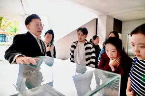 艺术家冯彬正在向参加活动的观众介绍作品以及展览理念