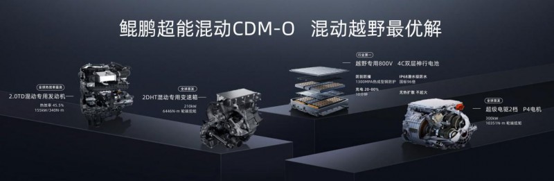 在配套系统方面,鲲鹏超能混动CDM-O系统同样展现“全球首创”实力。搭载全球首款纵置2挡DHT混动专用变速箱,传动效率高达98%,可实现“低速大扭矩、高速低油耗”的无缝切换;全球首发的2挡P4电机最大功率 300kW,1 挡速比达 23.8,后轮端峰值扭矩达10351N・m,为越野脱困提供强劲动力支撑;配合800V宁德时代混动专用电池,配备1300MPA热成型钢板防护,兼顾安全性与续航能力。