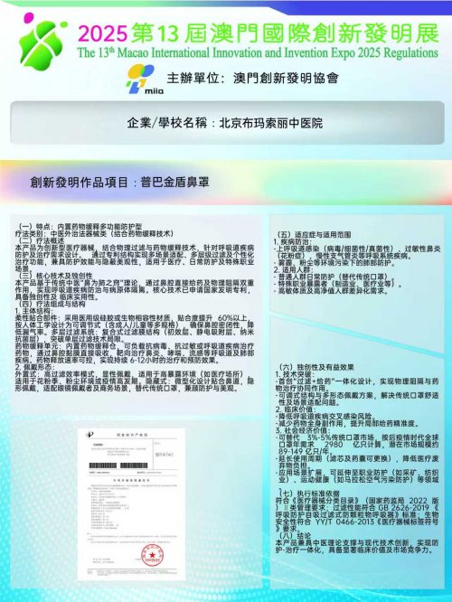 2025年10月31日至11月2日,在澳门会展中心举办的“2025第十三届澳门国际创新发明展”上,由海南夏日东生物科技有限公司、北京布玛索丽中医院研发的“普巴金盾鼻罩”凭借其独特的设计理念与技术创新,斩获展会金奖(GOLD),成为健康防护领域的一大亮点。