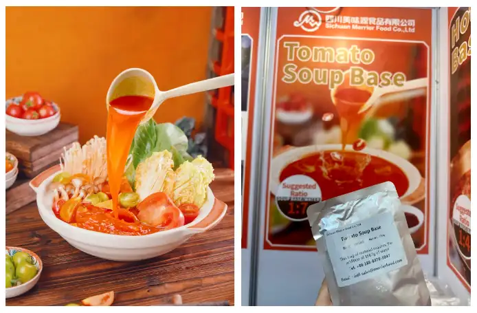 番茄汤—跨场景的万能汤底。采用新疆日照番茄,经去皮熬酱+慢炖出沙,保留了果酸的清爽口感与天然鲜的醇厚底味,色彩与风味双重吸睛。不仅适合国内火锅、粉面、麻辣烫赛道,更契合海外餐饮需求—欧洲采购商现场品鉴后表示:“这款番茄汤煮牛肉、搭配意面都好吃,能直接复用在门店里,省了很多时间成本。”