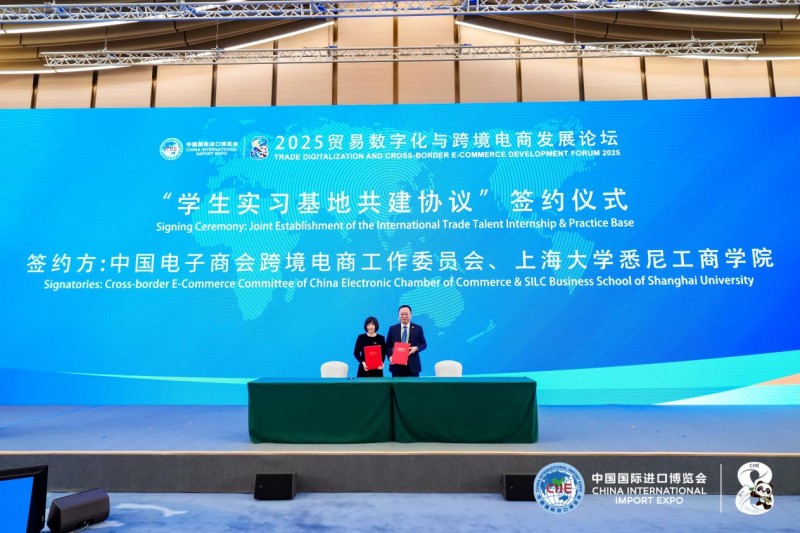 中国电子商会跨境电商工作委员会秘书长沈跃华与上海大学悉尼工商学院副院长蔡震尧代表签署“学生实习基地共建协议”。