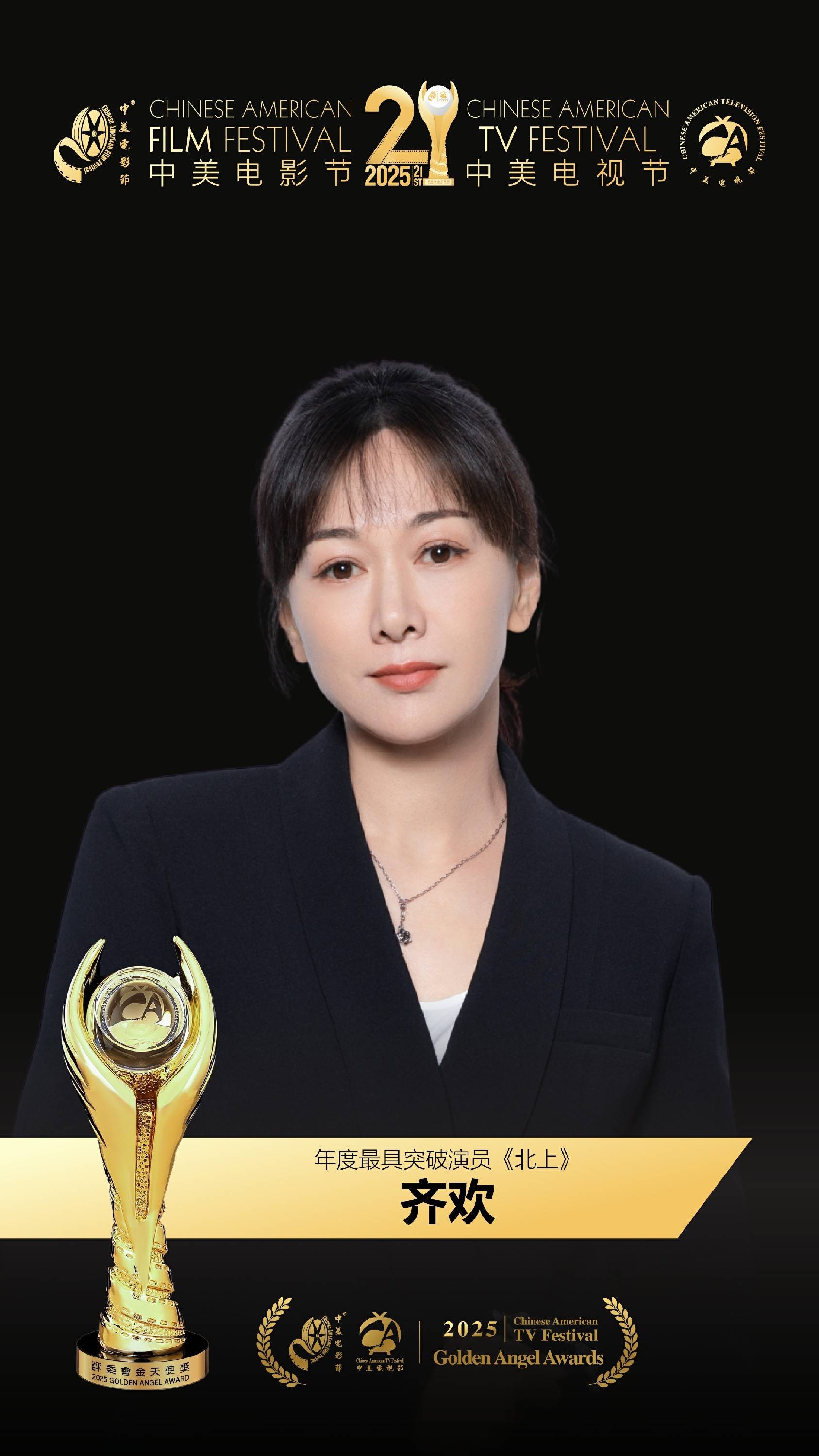 演员齐欢获第21届中美电视节“年度最具突破演员”奖