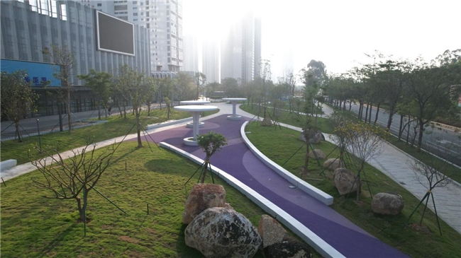 这批提升工程涵盖运动场馆维修、配套设施建设、道路升级及城市风貌整治等内容,是全运会城市服务保障的重要组成部分。项目建设过程中,中铁三局作为参建单位,高效统筹,有序推进,累计完成新增及改造绿化面积约2.65万平方米,新建人行步道600余米,栽植乔灌木800余株,建成综合性城市公园1座,打造了“帆船竞渡”主题花坛、“激情全运,逐梦汕尾”标语景观等多个具有全运会特色的景观工程,营造出浓厚的赛事氛围。