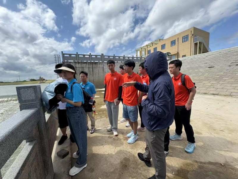 7 月 8 日上午,实践团的首站来到郎溪县水利拦蓄工程。对于大一水利专业的同学们而言,这是首次近距离接触大型水利设施,每一处细节都让大家充满好奇与震撼。远远望去,拦河大坝宛如一条灰色巨龙横卧在河道之上,气势磅礴。坝体采用钢筋混凝土精心浇筑而成,表面刻有细密的防滑纹路,既保证了结构稳定性,又兼顾了实用安全性。“这座大坝坝高 28 米,长度超过 300 米,具备抵御 50 年一遇洪水的强大能力,是区域防洪体系的重要组成部分。” 带队的方佩佩老师详细为同学们介绍工程概况,从设计理念到施工工艺,从结构特点到防护标准,层层拆解,让大家对水利工程的专业性有了初步认知。