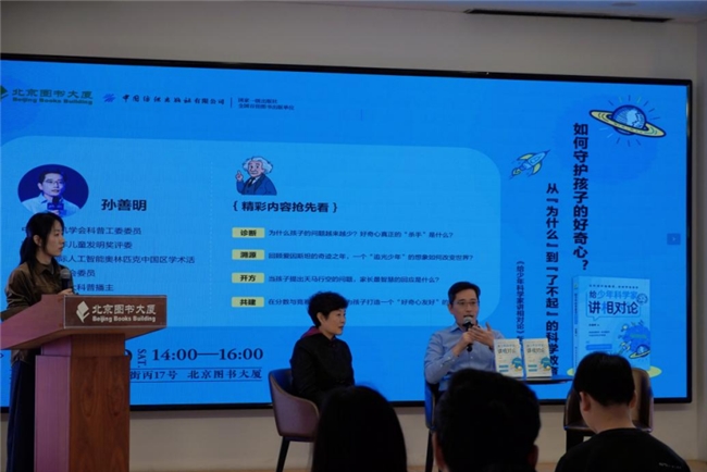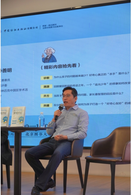 11月9日,由中国纺织出版社主办的《给少年科学家讲相对论》新书分享会在北京图书大厦一层共享空间举行。作为出版社深耕青少年教育领域、整合优质作者与作品资源的一次重要实践,本次活动特别邀请到《给少年科学家讲相对论》作者、中国计算机学会科普工作委员会委员孙善明,与《青春期突围:成长型父母的进阶课》作者、首都师范大学回龙观育新教育集团高级教师周瑾展开对谈,由中国纺织出版社策划编辑邢雅鑫主持。现场汇聚众多亲子家庭,围绕“青少年好奇心培养”和“AI时代学习方式”等核心议题,展开了一场兼具深度与温度的交流,充分彰显了中国纺织出版社在文化传播中整合优质内容、搭建跨领域思想交流平台的积极作为。