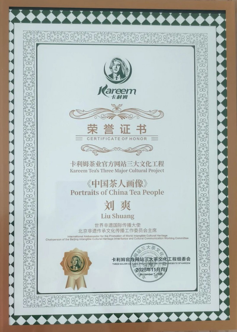 活动的核心颁奖环节备受瞩目。世界非遗国际传播大使、北京非遗传承文化传播工作委员会主席刘爽女士,凭借在非遗文化传播与茶文化推广领域的突出贡献,成功入选《中国茶人画像》。