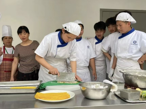 “这道蟠龙菜是钟祥非遗,我们不仅要学会做,还要能讲出背后的历史故事。”在楚菜文化课上,非遗传承人正在向学生们演示传统技艺。学校将非遗传承作为育人特色,编撰《钟祥非遗烹饪技艺图鉴》校本教材,将多项非遗项目纳入必修课程,并聘请非遗传承人进驻大师工作室,通过师徒制传授技艺。此外,学校还建立数字化非遗资源库,组建非遗传承社团,让学生在学习技能的同时,深度理解传统文化内涵,使烹饪教育既有“锅铲声”,更有“文化味”。