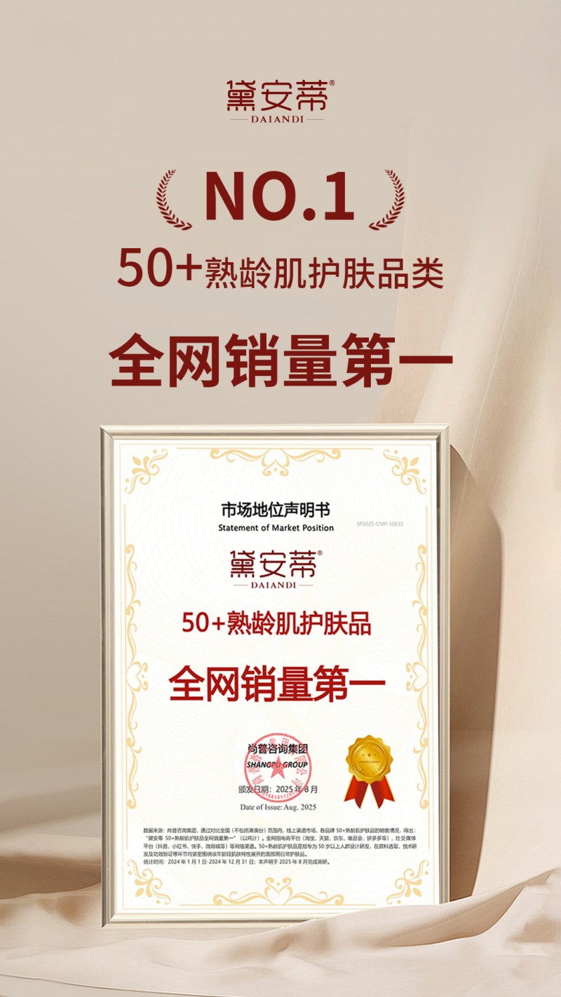 2025年8月,专注50岁以上熟龄肌抗衰的国货品牌黛安蒂,凭借在细分领域的卓越表现,荣获尚普咨询集团两大权威认证——《50+熟龄肌护肤品类开创者市场地位研究报告》与《50+熟龄肌护肤品全网销量第一市场地位研究报告》。这两份报告通过严谨论证,确认黛安蒂不仅是“50+熟龄肌护肤品类开创者”,更在2024年实现该品类全网销量954吨,以“开创+领跑”的双重优势,树立银发护肤领域新标杆。