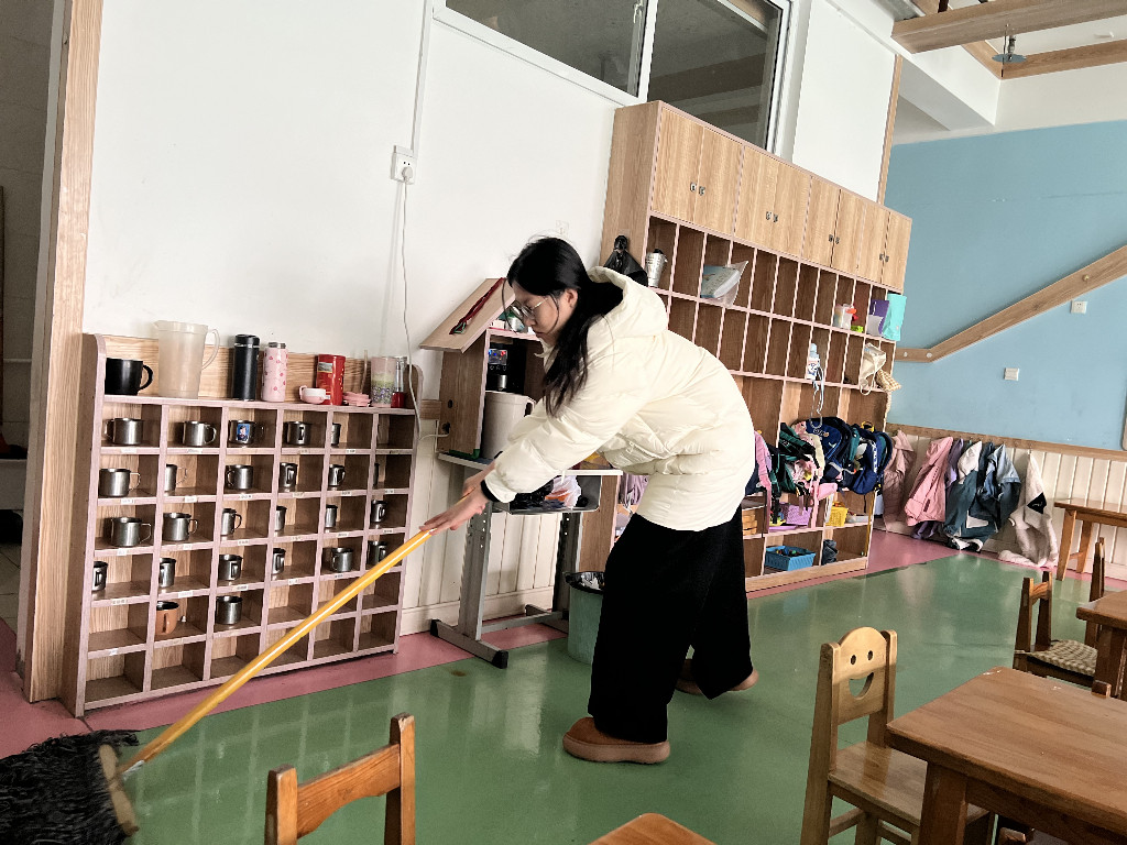 清晨的活动室里,实践团成员先进行教室的清洁,用消毒水扫地、拖地、擦桌子等等,将活动室的水杯架、玩具柜整理得井井有条——从清洁消毒到物品归置,用细致的准备迎接孩子们进入教室。