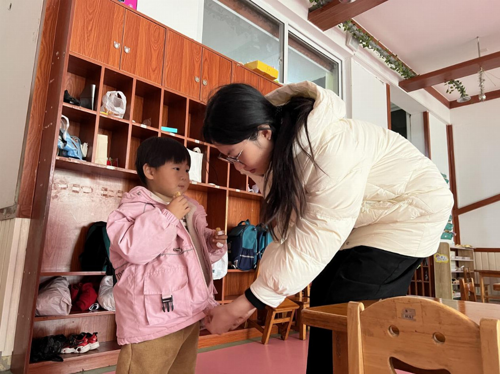 图为实践团成员帮小朋友穿衣服