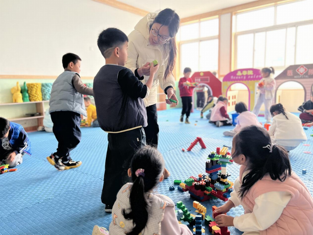 图为实践团成员为孩子们讲解积木与空间意识