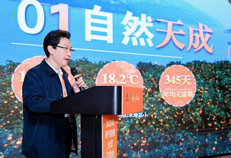 奉节县供销合作社联合社理事会主任王海林在现场对奉节脐橙进行了全面推介。他详细介绍了奉节脐橙在品种培优、绿色栽培、品质提升、科技赋能等方面取得的成效,以及通过强化市场营销、拓展线上业态、推动橙旅融合等举措,不断提升产业效益和品牌声誉的发展路径。他强调,奉节脐橙始终坚持“绿色生态、诚实守信”,以匠心守护品质,让消费者“买得放心、吃得安心”。