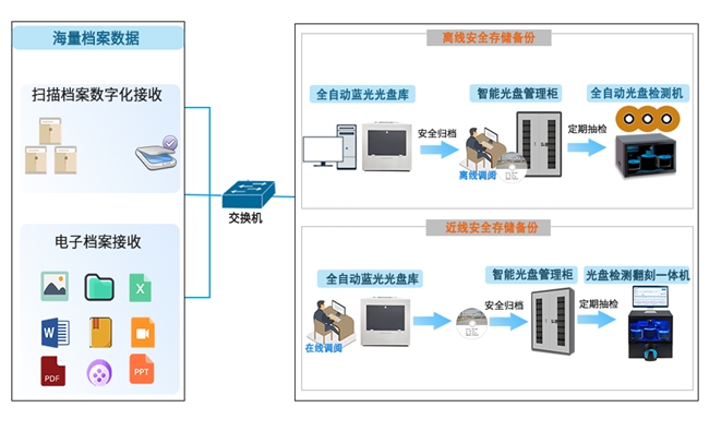 根据目前市场上无论是党政单位、档案行业、公采行业、公检法纪及军工涉密等保密行业均需满足档案长期保存归档的要求。依据档案政策法规相关要求,符合电子档案长期安全管理要求的存储介质,主要有磁介质、光介质、缩微胶片三种。所以现在各单位在选择离线方式中需要用到光介质。那么如何选择既能实现海量存储、高效管理,又能确保档案数据长期安全稳定保存策略呢?成为当前亟待解决的关键问题。
