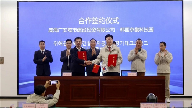 座谈结束后,威海广安城市建设投资有限公司与京畿科技园共同签署园区合作协议,并举行“京畿科技园威海事务所”揭牌仪式。