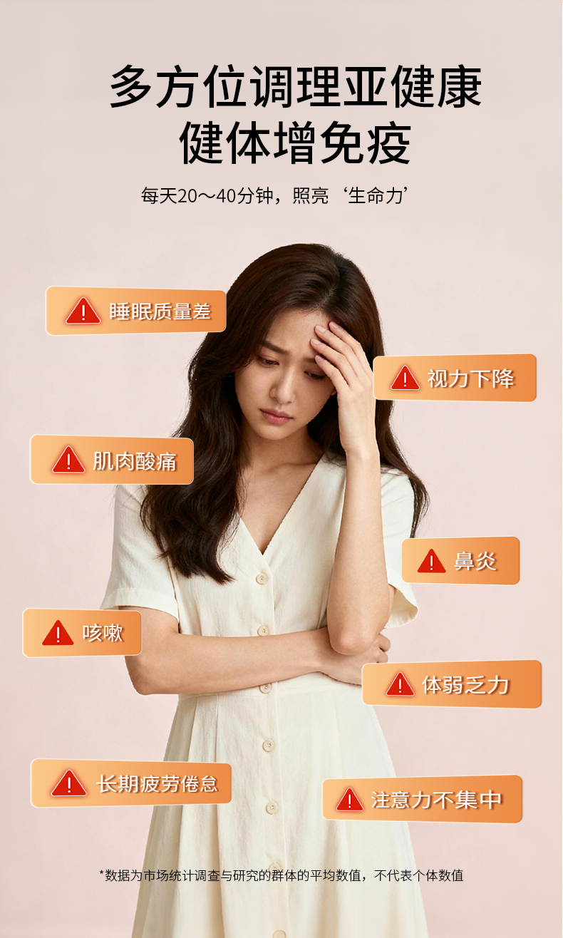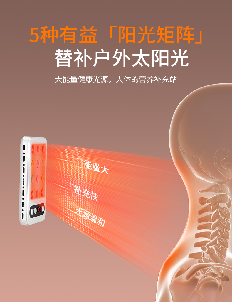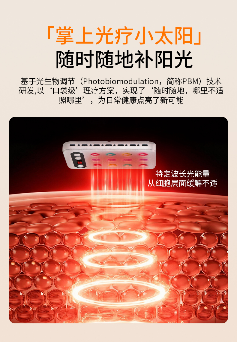 口袋小太阳,只有手机大小,就像你的‘掌上光疗师’,将5种有益光矩阵集成一次性补充,每天30分钟,改善阳气不足、塞湿不适等亚健康问题。