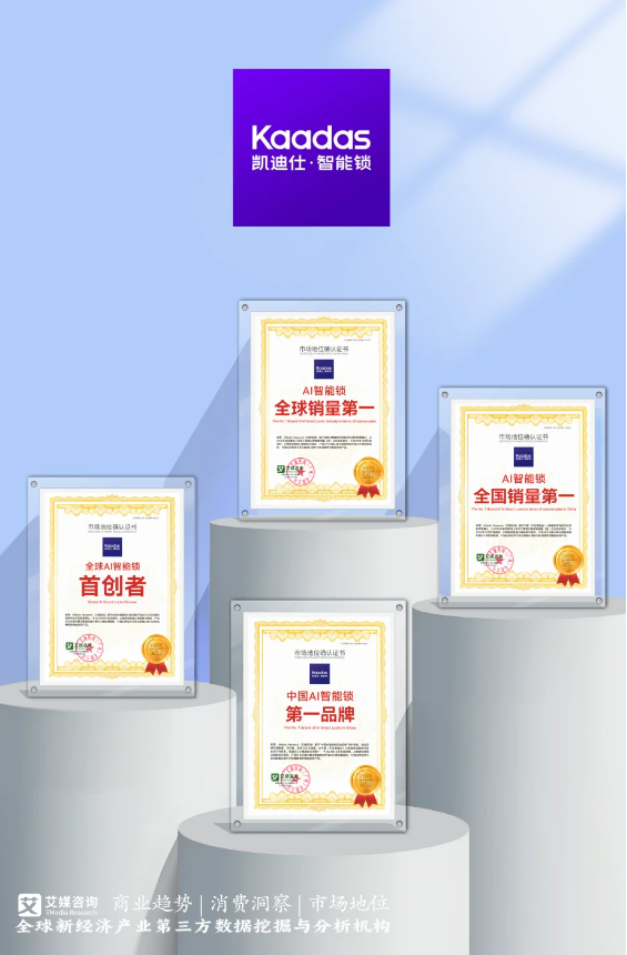 基于艾媒自主研发并获得省部级重大科技专项立项的CMDAS大数据系统监测及严格的调查,以及对中国(不含港澳台)AI智能锁行业研究比对的结果进行统计确认,Kaadas凯迪仕荣获全球领先的新经济产业第三方数据挖掘和分析机构iiMedia Research(艾媒咨询)授予的“全球AI智能锁首创者”“中国AI智能锁第一品牌”“AI智能锁全球销量第一”“AI智能锁全国销量第一”多项市场地位确认。