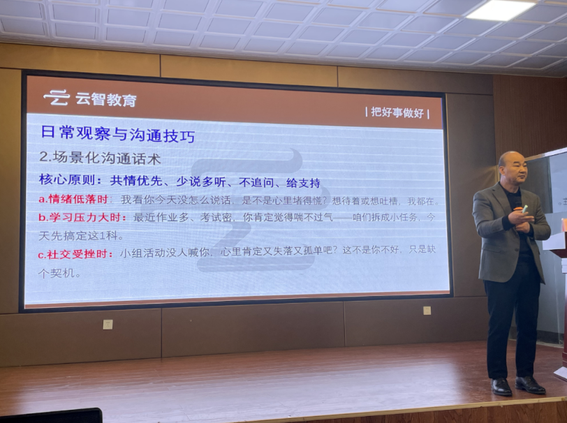 培训核心围绕六大模块展开:一是认知破局,明确心理预警是 “支持信号”;二是日常实操,讲解观察与沟通技巧;三是家校协同,提供避坑指南与沟通模板,强调沟通留痕;四是专业衔接,明确班主任边界;五是风险防控,强化隐私保护;六是自我关怀,引导教师建立心理边界,避免过度内耗。(颜芳 蔡甜)