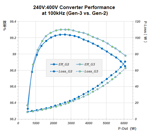 在约2500W的输出功率(P-out)下,效率高达99.3%,进一步实现性能跃升。(**是指在测试电路 Boost 半桥升压电路 240Vin-400Vout 中得到)
