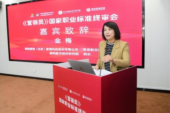 清控紫荆教育资深副总裁、紫荆数字经济研究院院长金梅致辞,她表示,国家职业标准是职业评价的基石,营销员作为连接市场与消费者的关键桥梁,其职业能力现代化水平对推动经济高质量发展至关重要。本次《营销员》国家职业标准的修订工作,是在数字经济蓬勃发展、消费模式深刻变革、营销技术日新月异的新形势下开展的一项关键性、基础性工作。清控紫荆教育非常荣幸能够与中华全国供销合作总社携手,共同承担这一光荣而艰巨的使命。在修订过程中,清控紫荆教育始终坚持以国家职业标准编制技术规程为指导,紧密结合产业发展实际和岗位需求变化,广泛调研,深入论证,力求使新标准更具科学性、前瞻性和实用性,能够准确反映当前及未来一段时期营销领域对从业人员知识、技能和素质的新要求。感谢各级领导的重视支持,也感谢评审专家们的莅临指导。