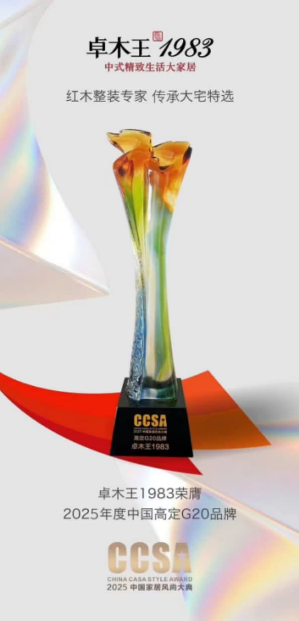 在行业荣誉层面,卓木王不仅是“收割者”,更是“定义者”。荣膺2024 CCTV《大国品牌》“75年75品牌”称号,成为红木行业唯一入选者,这不仅是对品牌的高度认可,更是整个红木行业的历史性高光。多次蝉联“中国高定G20品牌”,则是对卓木王从红木家具成功战略转型至红木整装,并在设计、工艺与服务等领域建立综合优势的权威背书。