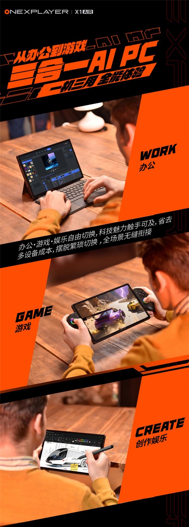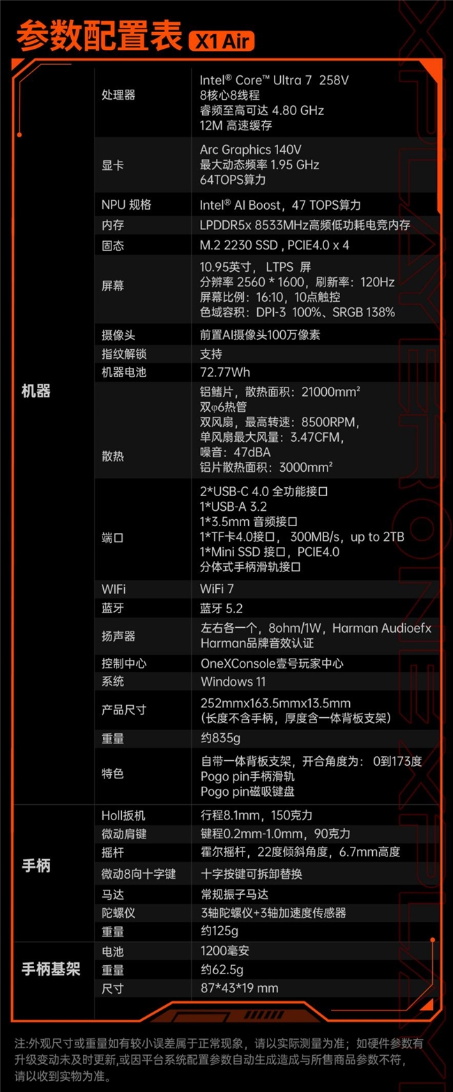 三合一PC壹号游侠X1 Air的核心亮点在于实现了掌机、笔记本与平板电脑三种形态间的自由切换。在掌机模式下,其人体工学手柄结合霍尔扳机与微动肩键,确保了精准且舒适的操控感;通过连接磁吸键盘,它可瞬间转变为高效生产力工具,应对移动办公需求;而在独立的平板模式下,设备配备的10.95英寸2.5K高清屏幕支持120Hz高刷新率,为用户提供了流畅细腻的视觉与触控体验。这种灵活的设计,全面覆盖了从游戏娱乐到移动办公的多种使用场景。