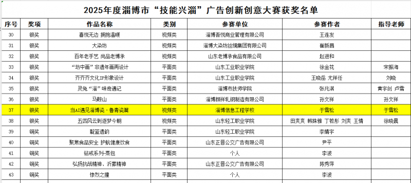 近日,从“技能兴淄”2025年度淄博市广告创新创意大赛官方传来喜讯,我校教师于雪松创作的AIGC文旅短片《当AI遇见淄博瓷·鲁青瓷篇》从众多参赛作品中脱颖而出,荣获大赛银奖。