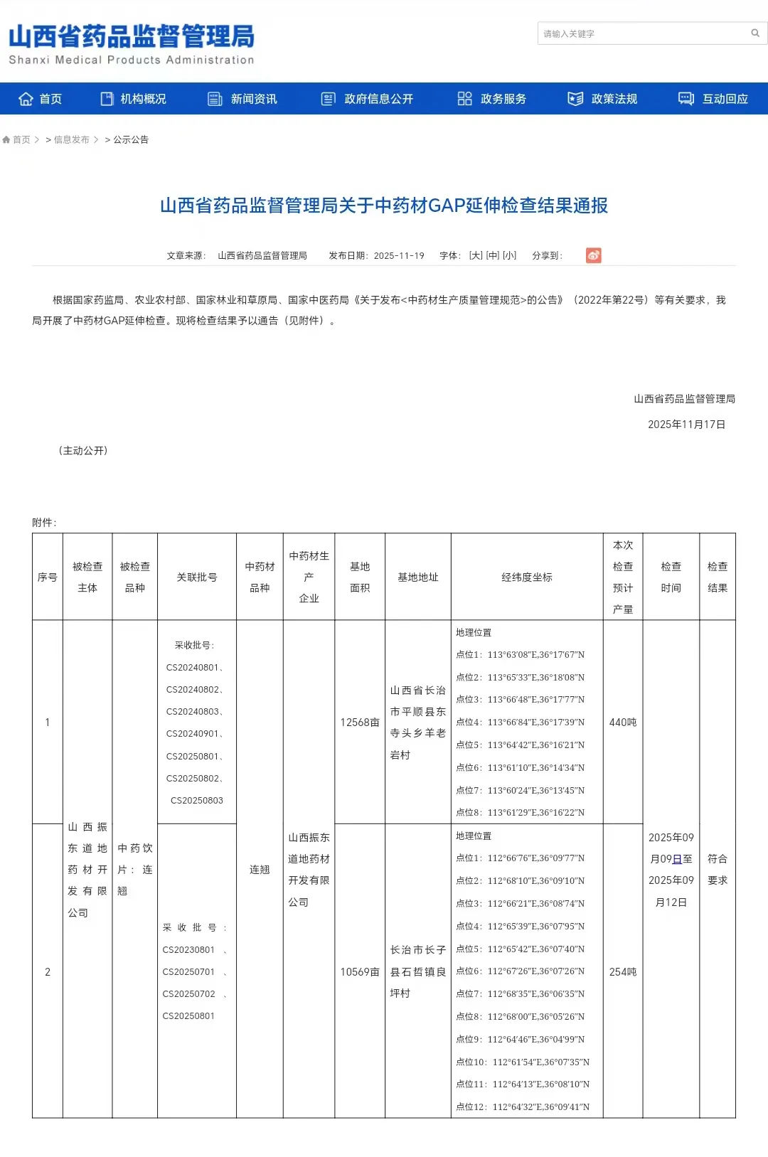 11月19日,山西振东道地药材开发有限公司(以下简称“振东中药材”)位于长治市的连翘种植基地,顺利通过山西省药品监督管理局组织的中药材GAP(生产质量管理规范)延伸检查,正式成为山西省首家通过该项检查的GAP基地。值得注意的是,连同此前已陆续通过现场检查的党参、黄芩、柴胡等基地,振东中药材已实现多个核心品种的GAP标准全覆盖。该成果标志着山西省在推进中药材规范化种植、强化源头质量控制方面迈出关键一步,也为全省中药生产企业自建或共建GAP基地树立了示范标杆。