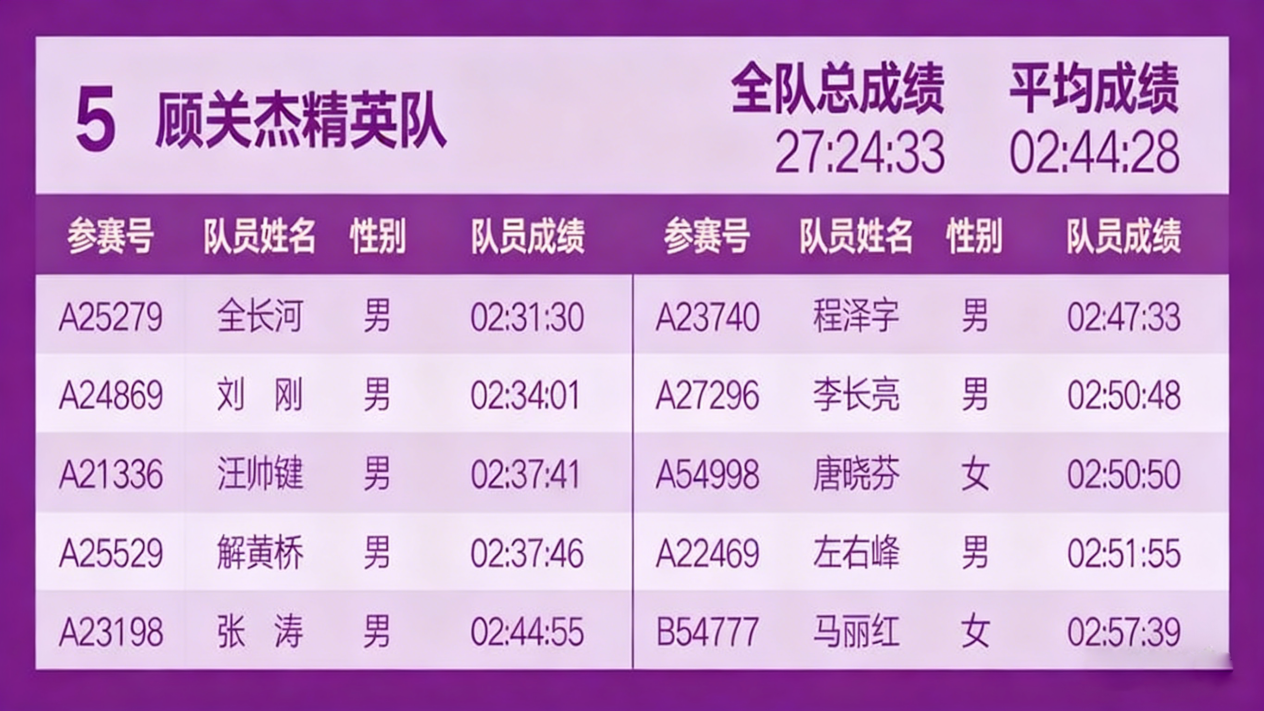 在 2025 南京马拉松的激烈角逐中,顾关杰精英队以全队总成绩 27:24:33、平均成绩 02:44:28的优异表现,勇夺团体第五名!