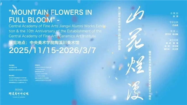 由中央美术学院、景德镇陶文旅控股集团主办,中央美术学院陶瓷艺术研究院、中央美术学院江西省校友联络处、景德镇陶邑文化发展有限公司联合承办,中央美术学院校友工作办公室、江西省美术家协会、景德镇陶瓷大学、江西师范大学美术学院、九江学院艺术学院、宜春学院美术与书法学院、上饶师范学院美术与设计学院鼎力支持的山花烂漫——第二届中央美术学院江西校友作品展暨中央美术学院陶瓷艺术研究院成立十周年于11月15日上午10点在中央美术学院陶溪川美术馆正式开幕,展览展至2026年3月7日。