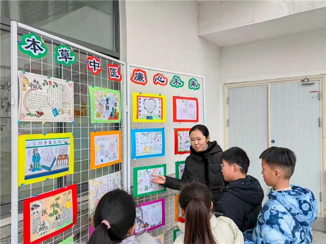 走进市人民路小学,中医药文化基石以书本造型矗立,镌刻《黄帝内经》《本草纲目》等典籍名句,彰显“治未病”与“防微杜渐”理念;篮球场外侧的“四大怀药”展柜中,学生围绕怀山药、怀菊花、怀地黄、怀牛膝创作的手工作品、绘画海报,巧妙融入廉洁寓意,让静态景观成为流动的教育课堂。