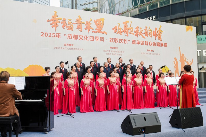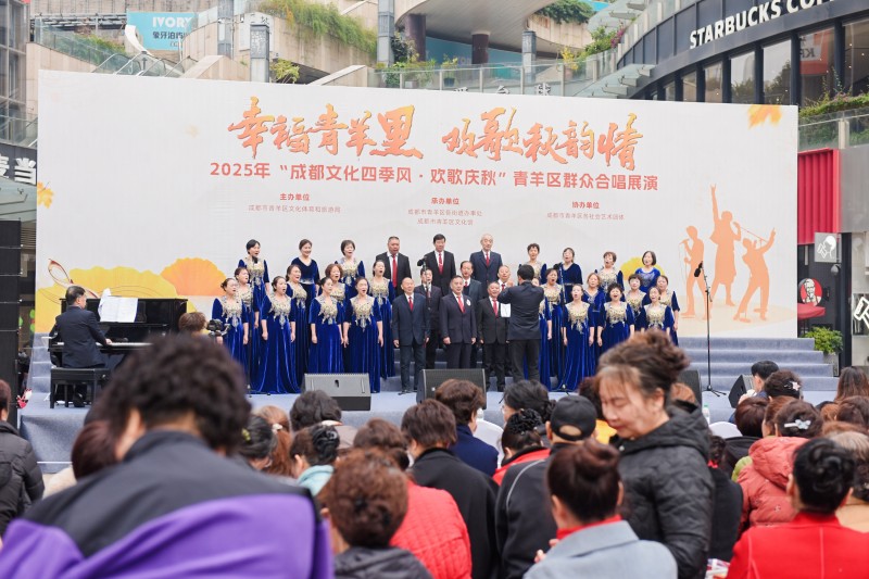 为深入学习贯彻习近平文化思想,丰富群众精神文化生活,由中共成都市青羊区委宣传部、成都市青羊区文化体育和旅游局主办,成都市青羊区文化馆承办,青羊区各街道办事处、青羊区各社会团体协办的“幸福青羊里 欢歌秋韵情”2025年“成都文化四季风·欢歌庆秋”青羊区群众合唱展演活动于11月21日上午10:00在青羊区西御河街道恒大广场温情启幕。