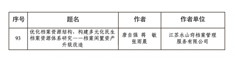 近日,捷报频传,由江苏永山窍档案管理服务有限公司(品牌名:窍楚档案)撰写的论文 《优化档案资源结构,构建多元化民生档案资源体系研究——档案闲置资产升级改造》 ,在两项重要的年度学术评选中脱颖而出,荣获双重荣誉!