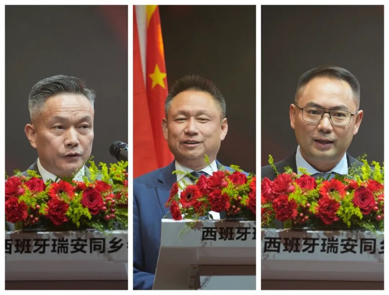 从左至右:西班牙温州同乡会会长郑晓光、西班牙青田同乡会会长朱晓海、西班牙华侨华人协会主席南俊致辞。